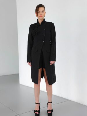 Crop top – rövid , hosszú ujjú, hátul hasíték, megkötőkkel Midi szoknya – magasított derekú, elõl hasítékkal crop top 36: háthossz cm, mellbőség  cm, derékbőség cm, ujjhossz cm; szoknya 36:hossza az oldalvarrás mentén – cm, derékbőség –  cm, csípő kerülete –  cm. A modell 173 cm magas és 36-as méretet visel.
