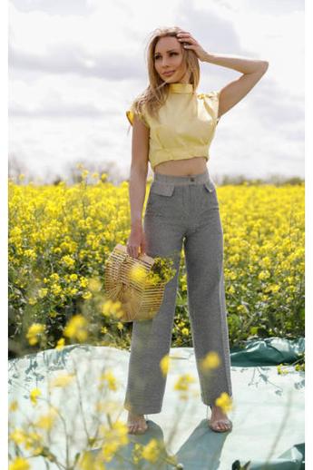 – mintás jacquard szövetnadrág – magas derékvonal – hosszú széles szárú, levarrt szegély – élre vasalt – oldalsó zsebek – hátul két zseb – elõl cipzáras és patentos rögzítés